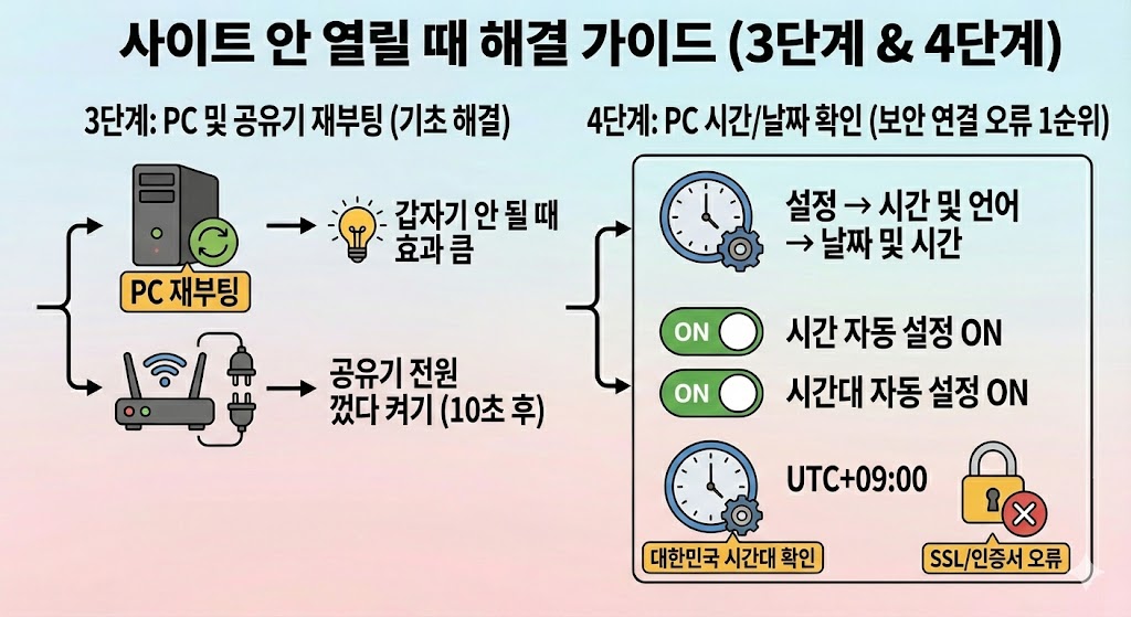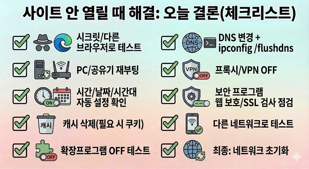 ✅ 사이트가 안 열릴 때는 대부분 DNS 문제, 캐시/쿠키 누적, 시간 설정 오류, 프록시/VPN/보안 프로그램 충돌 중 하나입니다.