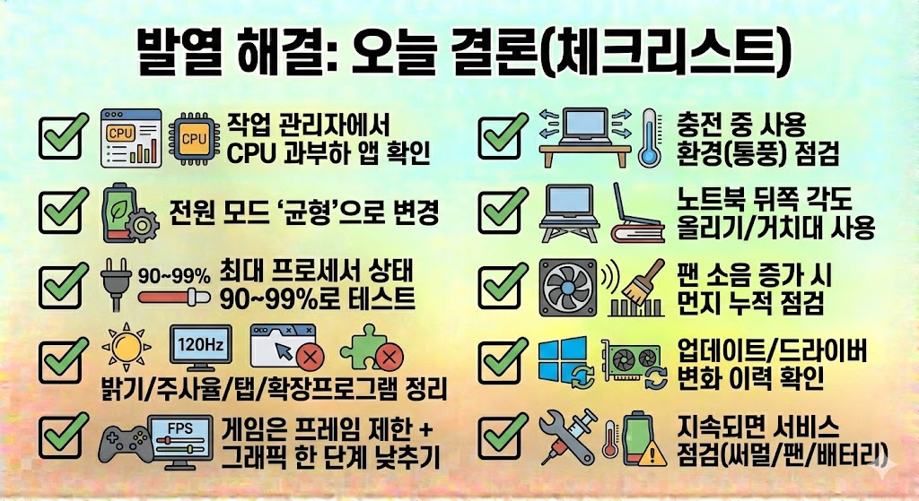 ✅ 먼저 “설정으로 낮출 수 있는 발열”을 잡고, 그래도 심하면 청소/써멀 등 하드웨어 점검으로 넘어가는 것이 안전합니다.