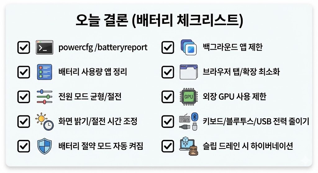 ✅ 배터리 빨리 닳음은 대부분 화면 밝기, 백그라운드 앱(브라우저/동기화/메신저), 고성능 전원 모드, 외장 GPU 사용, 배터리 노후 중 하나입니다.