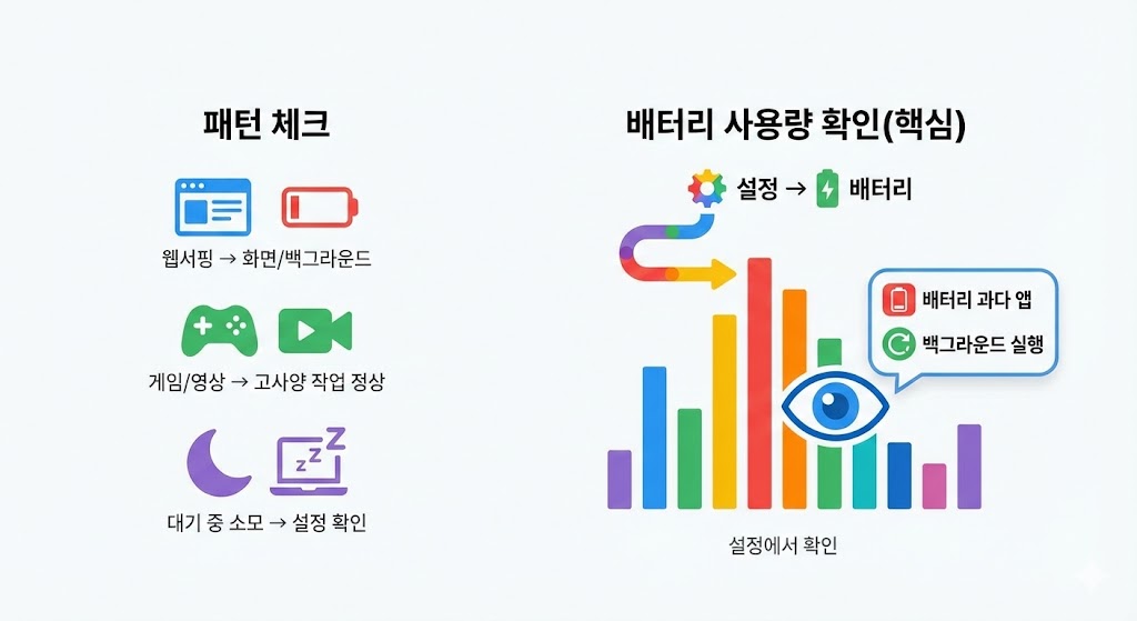 백그라운드에서 업데이트/동기화/브라우저 탭이 급증했을 수 있습니다. 먼저 “배터리 사용량 상위 앱”을 확인하는 것이 가장 빠릅니다.
