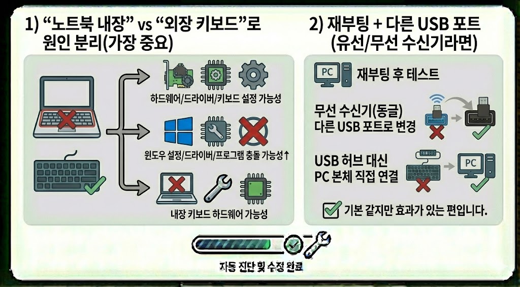 1) “노트북 내장” vs “외장 키보드”로 원인 분리(가장 중요)
