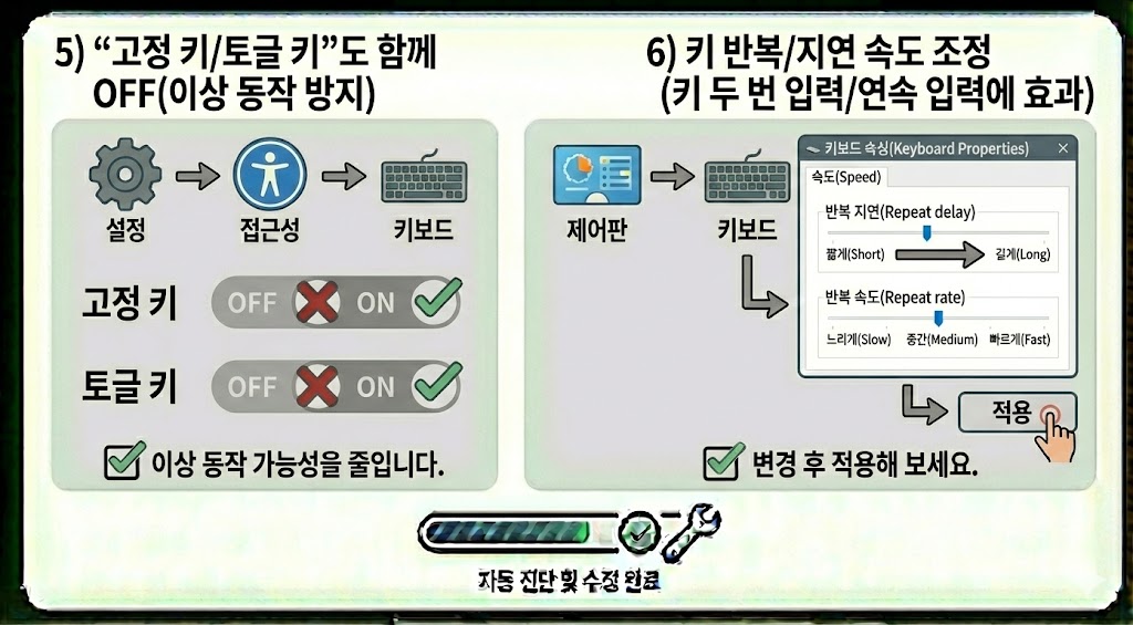 ✅ 키보드 문제는 대부분 (1) 접근성 설정(필터 키/고정 키) 켜짐, (2) 반복 속도/지연 설정, (3) 드라이버 꼬임, (4) 무선 간섭/전원 관리에서 발생합니다.