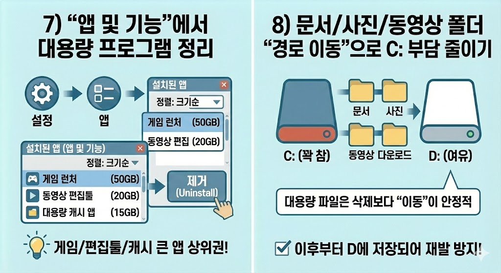 문서/다운로드/사진/동영상 폴더를 D로 옮기고, 이후부터 그쪽에 저장되도록 설정하면 재발 방지에 좋습니다.