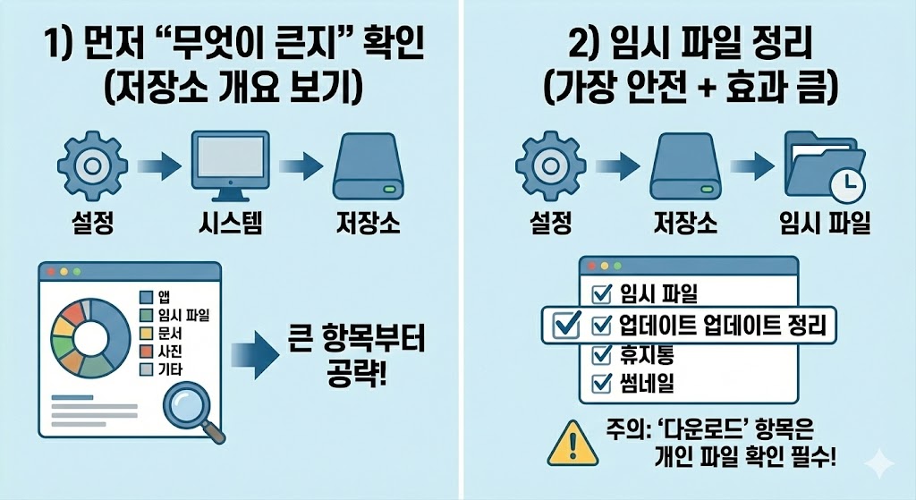 ✅ C드라이브 정리는 “무작정 삭제”가 아니라 (1) 윈도우가 만들어 둔 임시/캐시부터 지우는 것이 안전합니다.