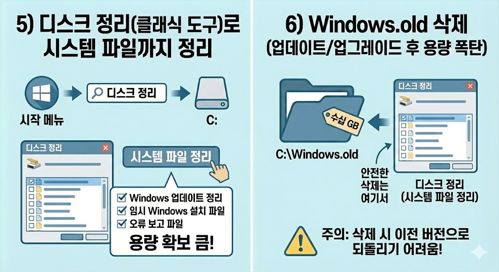 5) 디스크 정리(클래식 도구)로 시스템 파일까지 정리