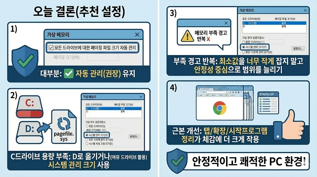 - 이상 증상이 있다면 가상 메모리보다 “메모리 범인 앱(크롬/시작프로그램)”을 먼저 정리하는 것이 효과적인 경우가 많습니다.