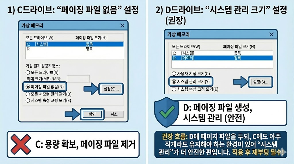 권장 흐름: D에 페이지 파일을 두되, C에도 아주 작게라도 유지해야 하는 환경이 있을 수 있어 “시스템 관리”가 더 안전한 편입니다.