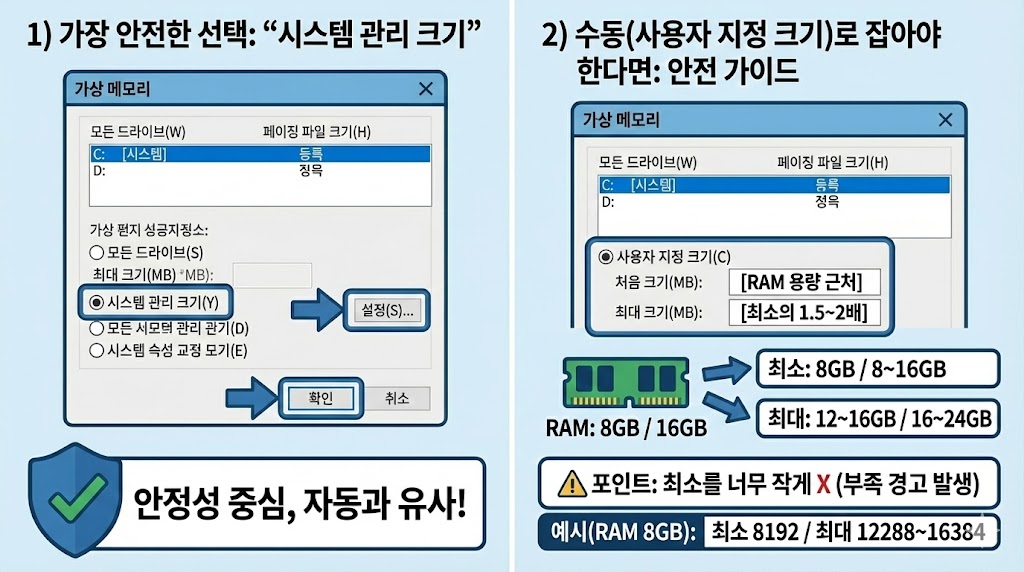즉, “가상 메모리를 늘린다”는 건 성능을 마법처럼 올리는 게 아니라, 멈춤/강제종료를 줄이는 안전장치 강화에 가깝습니다.