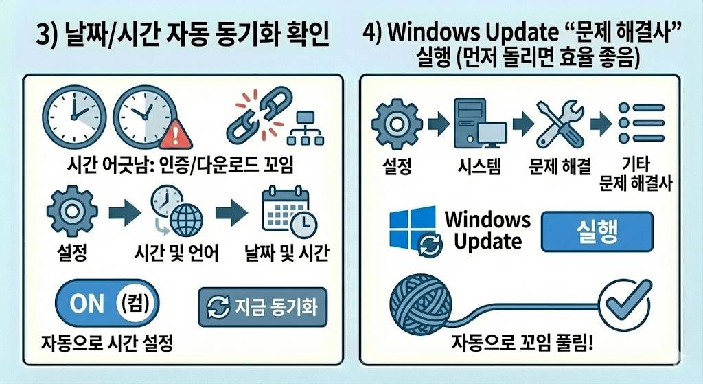 시간이 어긋나면 업데이트 인증/다운로드가 꼬일 수 있습니다.
