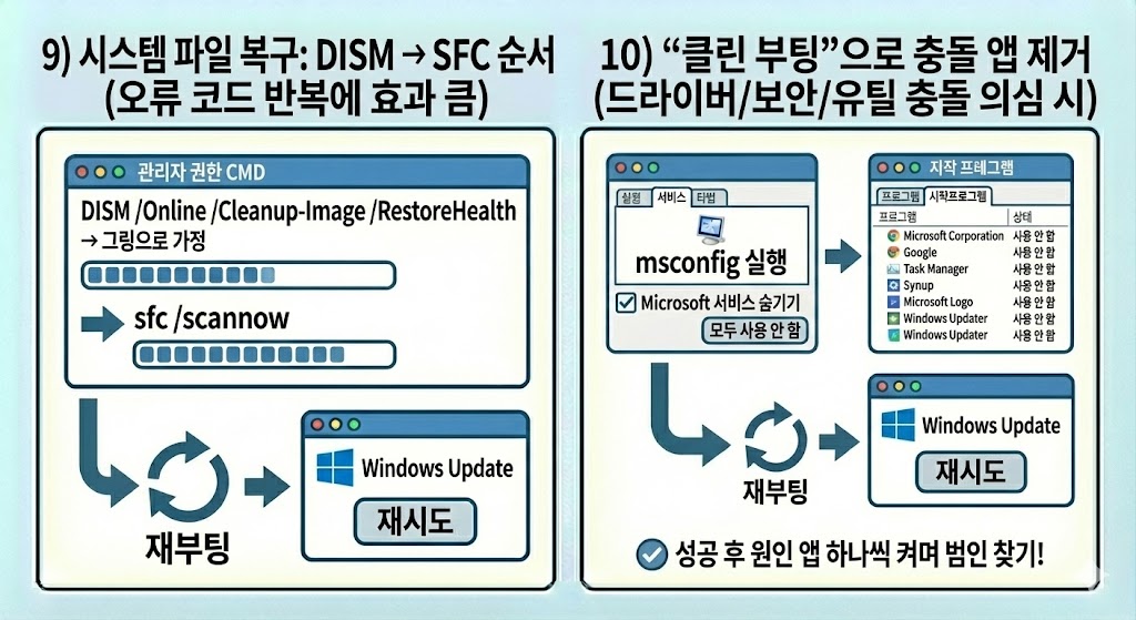 ✅ 해결 순서는 문제 해결사 → 재부팅/공간 확보 → 업데이트 구성요소 초기화(캐시 리셋) → DISM/SFC 복구 → 클린 부팅이 가장 빠릅니다.