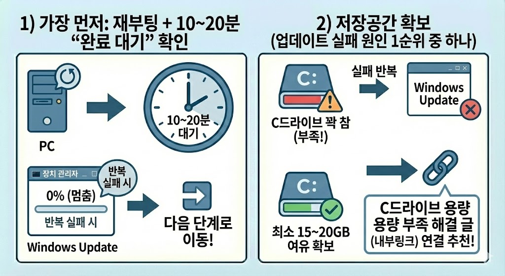 업데이트는 디스크/CPU를 많이 쓰기도 합니다. 디스크 100% 글(이미 작성하신 “갑자기 느려짐/작업 관리자” 글과도 연결)을 내부링크로 묶으면 체류시간이 올라갑니다.