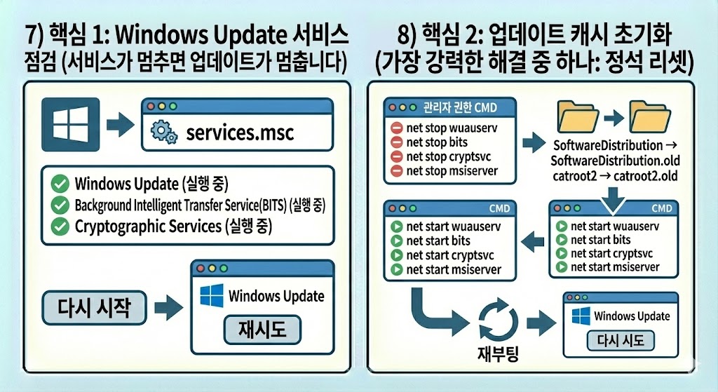 업데이트 캐시가 꼬이면 동일 오류가 반복됩니다. 아래는 “정석 리셋”입니다.