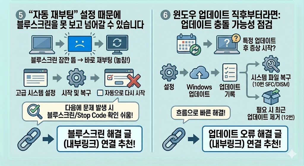 그리고 블루스크린이 “아예 없었던 것”이 아니라, 자동 재부팅 설정 때문에 놓친 경우도 꽤 많아요.