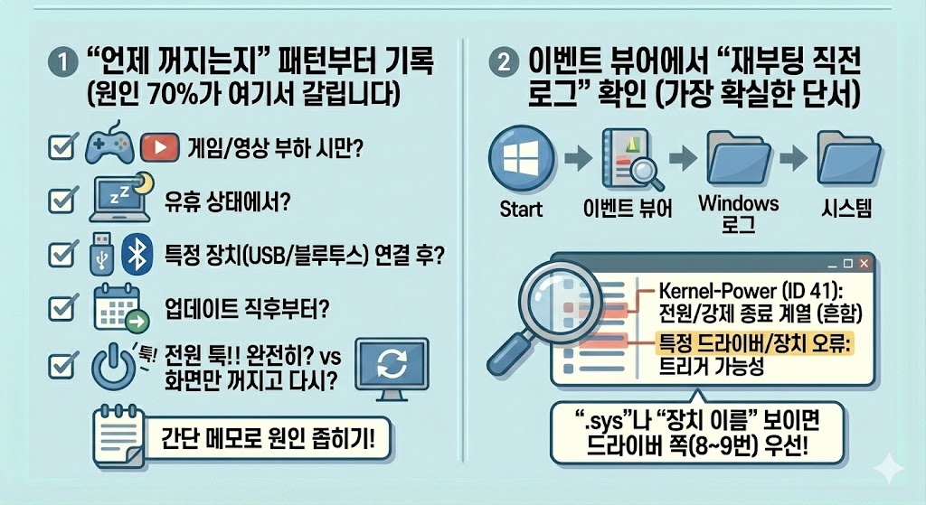 ✅ 가장 빠른 순서는 **이벤트 뷰어로 원인 단서 확인 → 발열/전원 점검 → 드라이버/업데이트 정리 → 시스템 파일 복구 → 충돌 프로그램 분리(클린 부팅)**입니다.