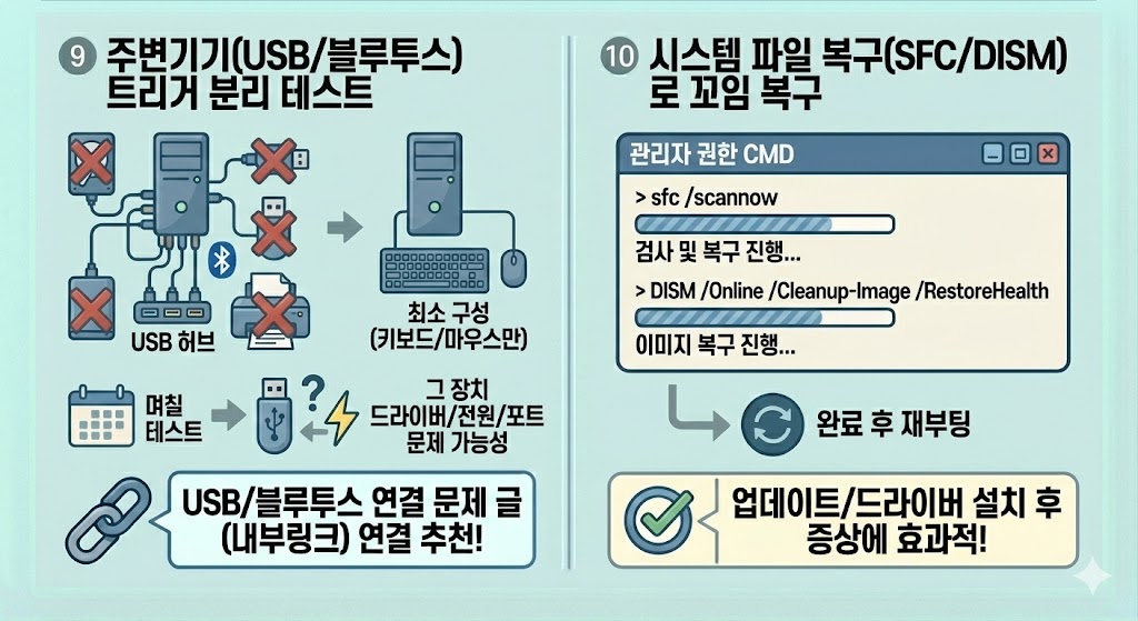 이벤트 뷰어(2)에서 단서를 잡고, 전원(3)과 발열(4)을 먼저 배제한 뒤, 드라이버/업데이트(6~10)로 넘어가는 흐름이 가장 효율적입니다.