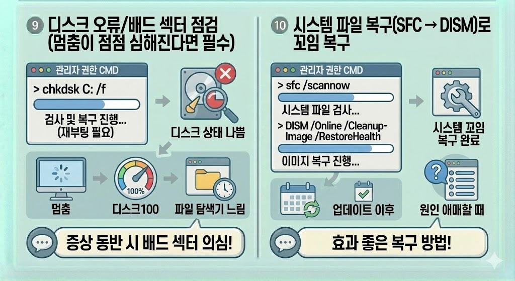 9) 디스크 오류/배드 섹터 점검(멈춤이 점점 심해진다면 필수)