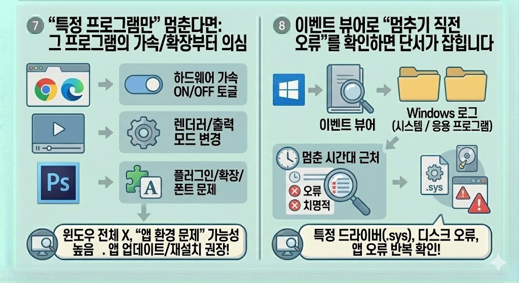 7) “특정 프로그램만” 멈춘다면: 그 프로그램의 가속/확장부터 의심