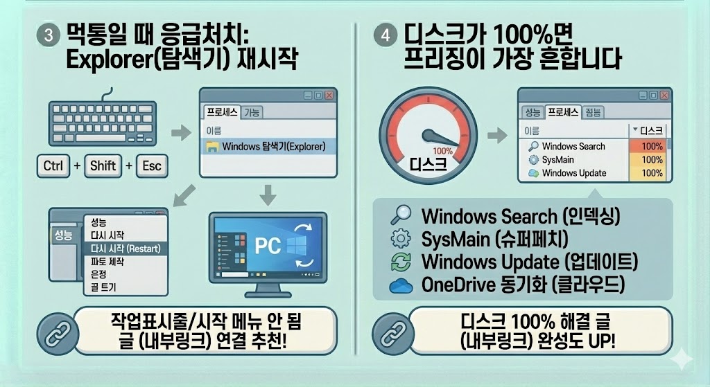 ✅ 프리징/먹통은 대부분 디스크 100%, 메모리 부족, 백그라운드 작업 폭주(업데이트/동기화), **드라이버 충돌(그래픽/저장장치)**에서 발생합니다.