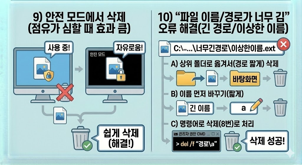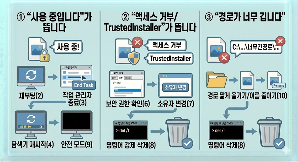 ✅ 해결 순서는 점유 프로세스 찾기 → 종료 → 관리자 권한/소유권 확보 → 안전 모드 삭제 → 명령어 삭제가 가장 빠릅니다.