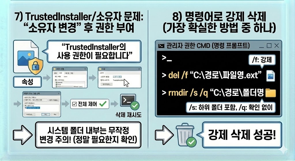 - “액세스 거부/TrustedInstaller” → 소유자 변경 + 전체 제어 / 안 되면 명령어로 강제 삭제