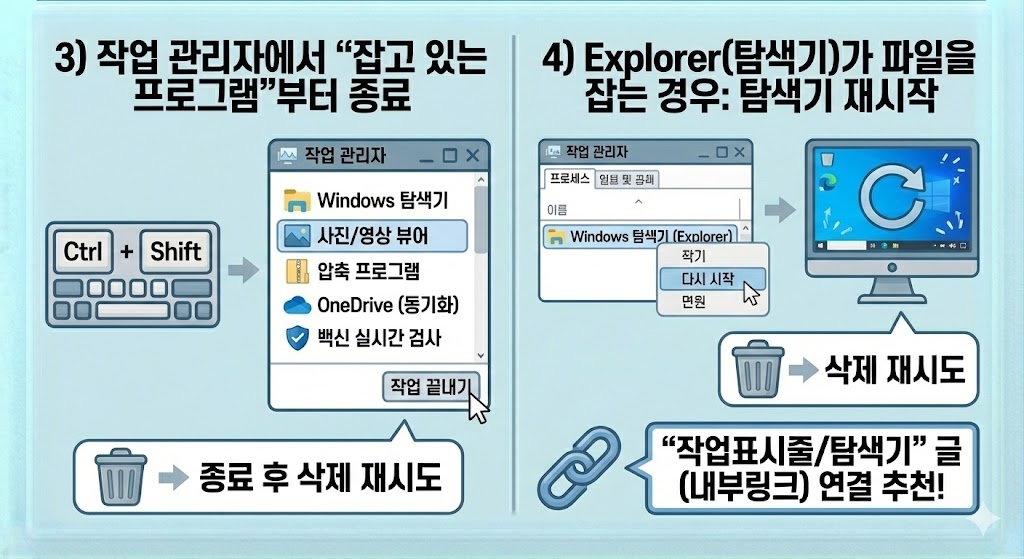 ✅ 삭제 실패는 대부분 (1) 파일을 잡고 있는 프로그램(점유) 또는 (2) 권한/소유자 문제(TrustedInstaller 포함) 때문입니다.