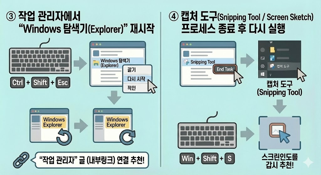 - 캡처 UI 자체가 안 뜸(Win+Shift+S/PrtSc 먹통) → 캡처 도구/탐색기 재시작 + PrtSc 설정 확인 쪽