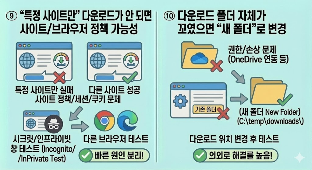 그래서 저는 항상 “다운로드 폴더를 새 폴더로 바꿔서 테스트”를 중간에 꼭 넣어요. 이게 의외로 한 방에 끝나는 경우가 많습니다.
