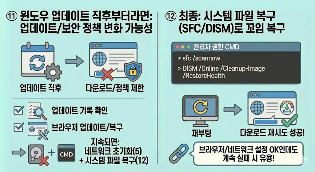 - 지속되면 네트워크 초기화(5번) + 시스템 파일 복구(12번) 흐름이 좋습니다.