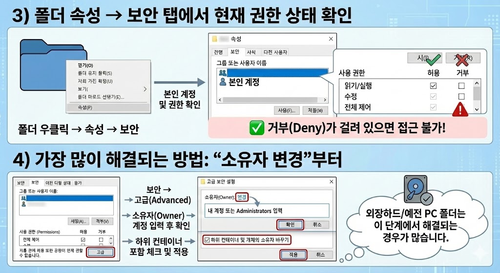 ✅ 외장하드/이전 계정 폴더 권한 꼬임은 이 조합이 해결률이 매우 높습니다.