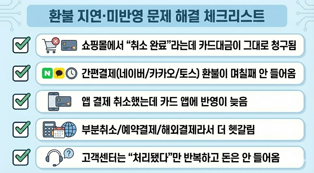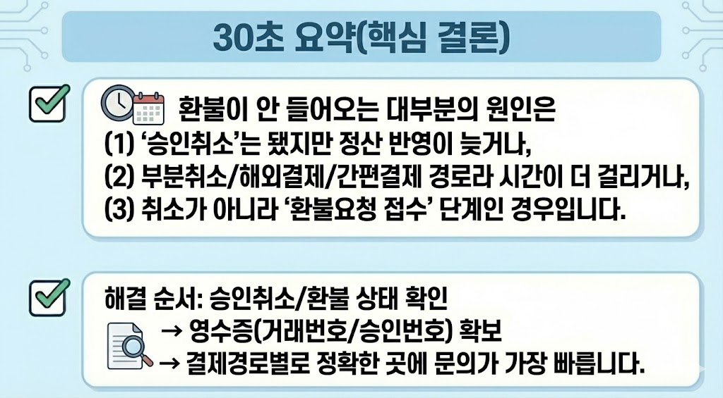 ✅ 환불이 안 들어오는 대부분의 원인은 (1) ‘승인취소’는 됐지만 정산 반영이 늦거나, (2) 부분취소/해외결제/간편결제 경로라 시간이 더 걸리거나, (3) 취소가 아니라 ‘환불요청 접수’ 단계인 경우입니다.