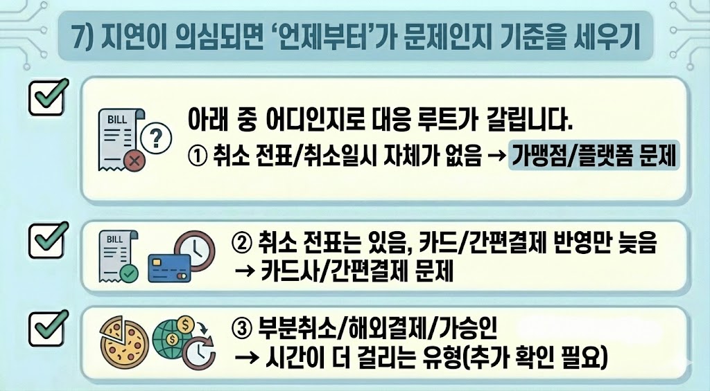 - ③ 부분취소/해외결제/가승인 → 시간이 더 걸리는 유형(추가 확인 필요)