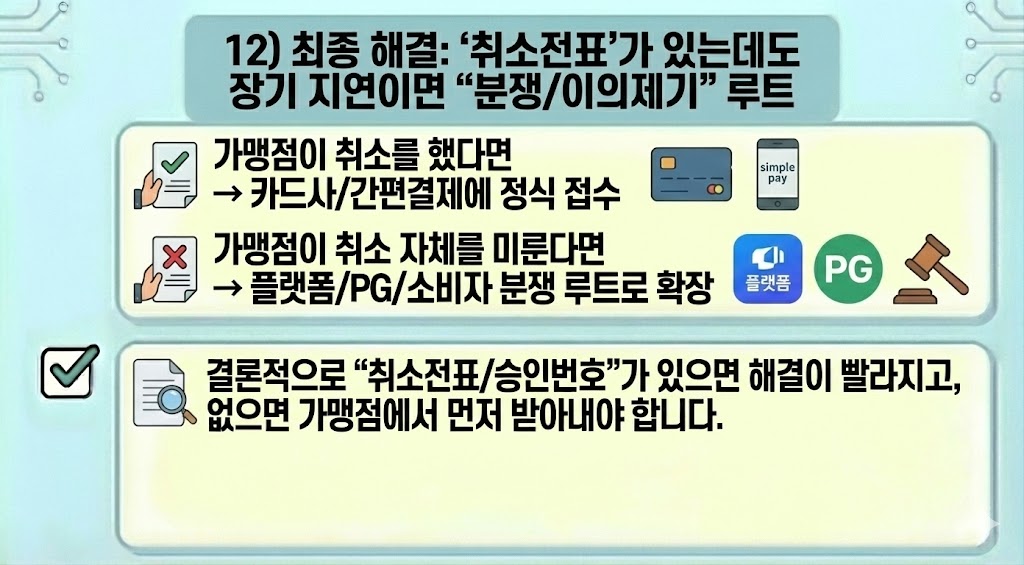 12) 최종 해결: ‘취소전표’가 있는데도 장기 지연이면 “분쟁/이의제기” 루트