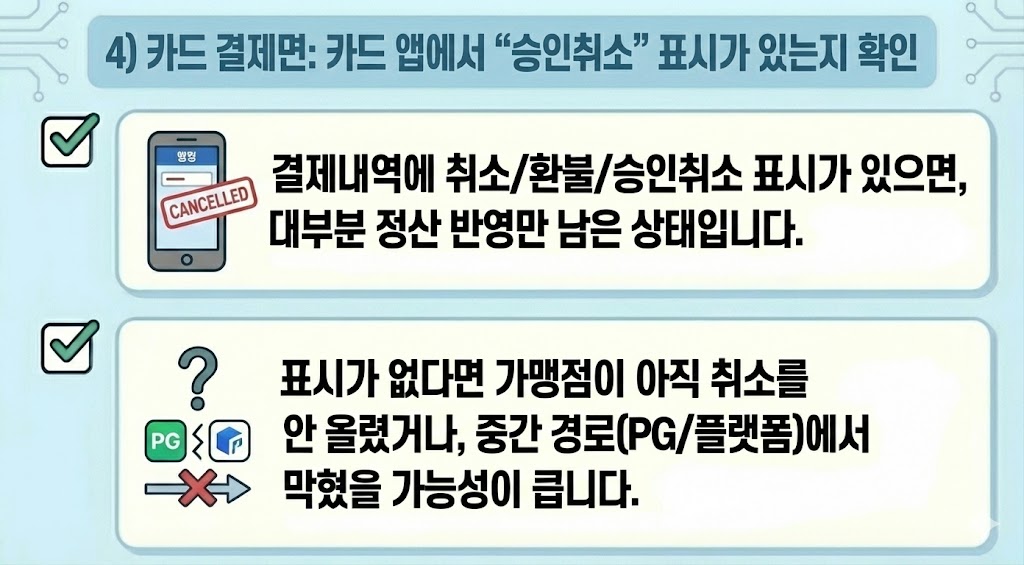 - 표시가 없다면 가맹점이 아직 취소를 안 올렸거나, 중간 경로(PG/플랫폼)에서 막혔을 가능성이 큽니다.