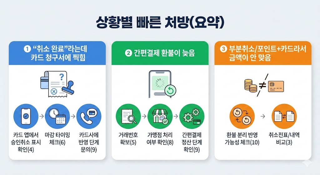 ✅ 해결 순서: 승인취소/환불 상태 확인 → 영수증(거래번호/승인번호) 확보 → 결제경로별로 정확한 곳에 문의가 가장 빠릅니다.