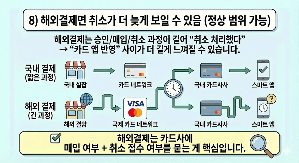 8) 해외결제면 취소가 더 늦게 보일 수 있음(정상 범위 가능)