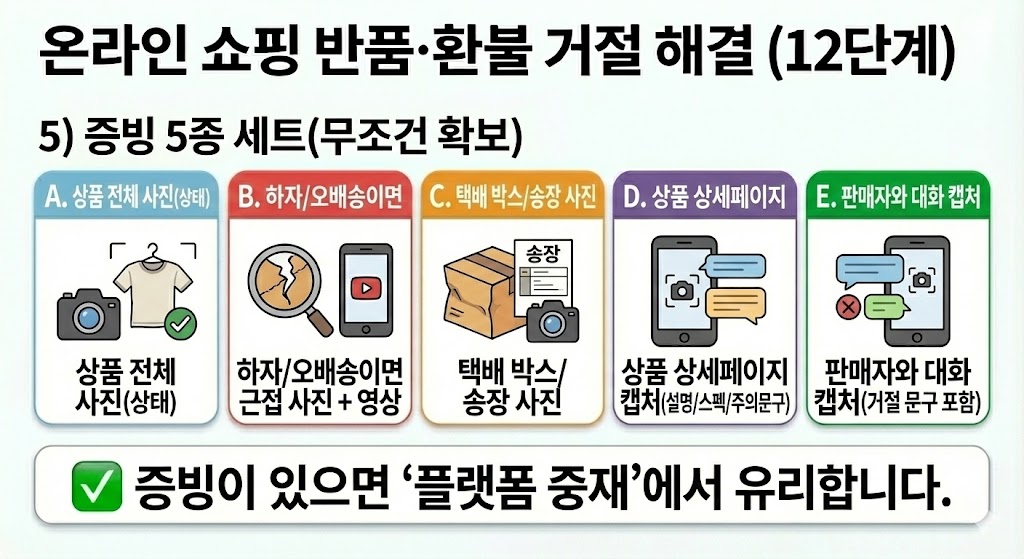 ✅ 빠른 순서: 사유 확정 → 기한 확인 → 증빙 확보 → 판매자 1차 요청(문구) → 플랫폼/결제수단 2차 → 분쟁 루트