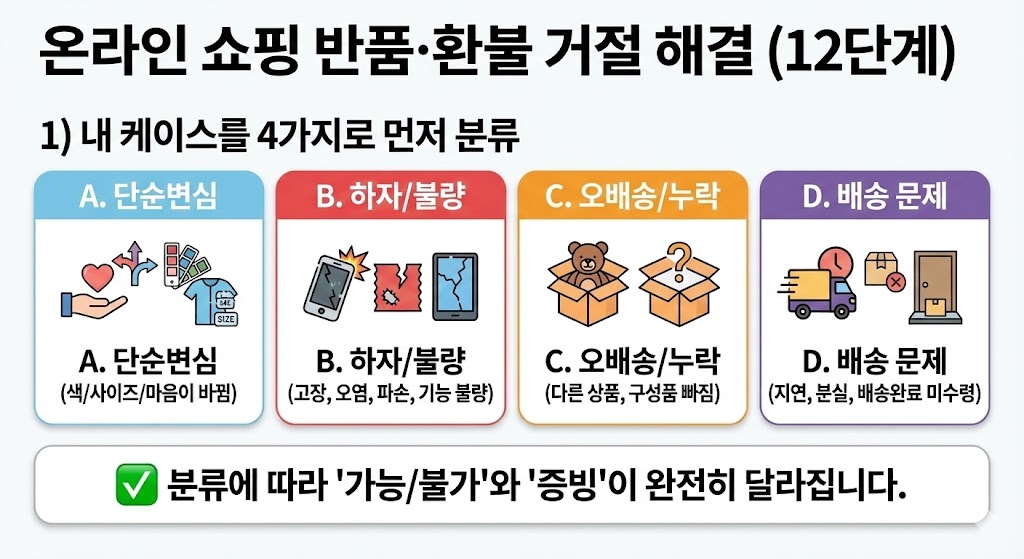 ✅ 온라인 반품·환불 분쟁은 **(1) 사유 분류(단순변심/하자/오배송/배송문제)**와 **(2) 증빙(사진·대화·송장)**만 제대로 잡으면 대부분 해결됩니다.