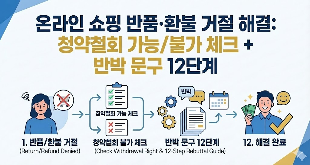 온라인 쇼핑에서 반품·환불을 거절당했을 때, 먼저 청약철회 가능한 유형(단순변심/하자/오배송/배송지연 등)과 제한되는 유형(맞춤제작/훼손/사용 등)을 체크하고, 증빙 확보 → 판매자 1차 요청 → 플랫폼/결제수단 2차 → 분쟁조정 루트까지 12단계로 정리했습니다. 바로 복붙 가능한 반박 문구 템플릿도 포함했습니다.