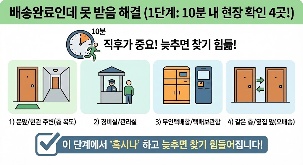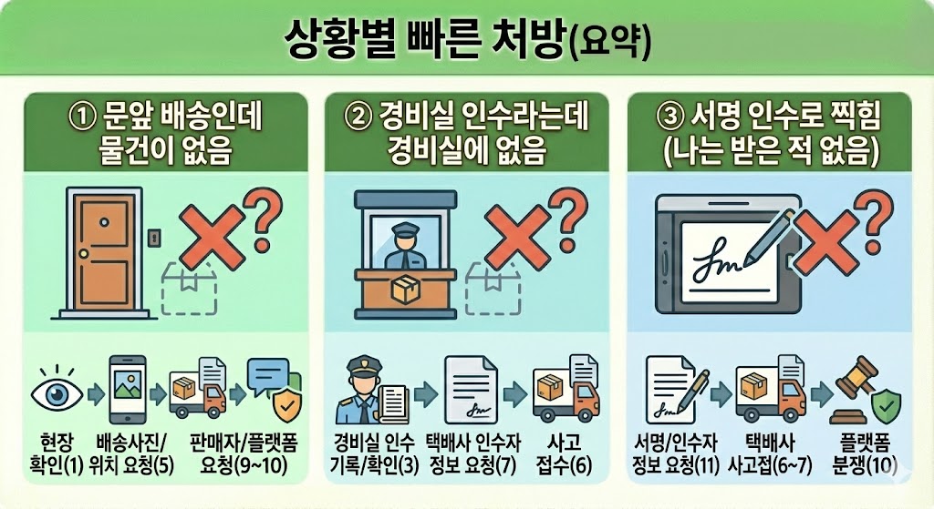 ✅ 빠른 순서: 현장 확인(문앞/경비실/무인함) → 택배기사/택배사 사고 접수 → 인수증/사진 요구 → 판매자/플랫폼에 환불(또는 재배송) 요청