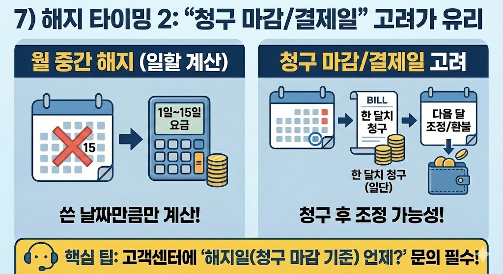- “해지일을 언제로 잡는 게 유리한지(청구 마감 기준)”를 고객센터에 묻는 게 좋습니다.