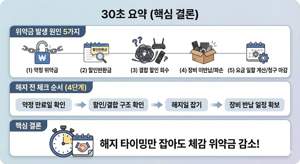 ✅ 위약금은 대부분 (1) 약정 위약금, (2) 할인반환금(받은 할인 토해내기), (3) 결합 할인 회수, (4) 장비 미반납/파손, (5) 요금 일할 계산/청구 마감에서 생깁니다.