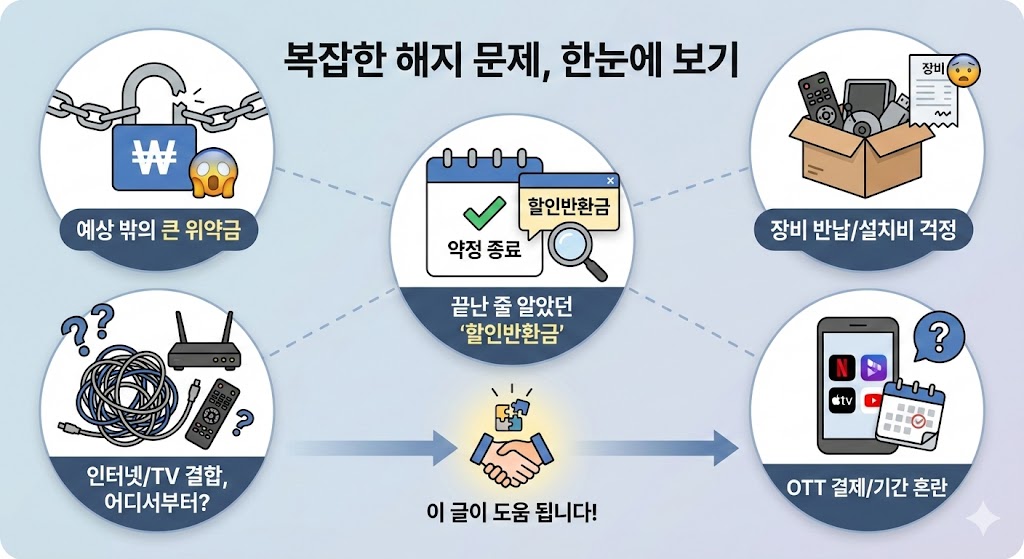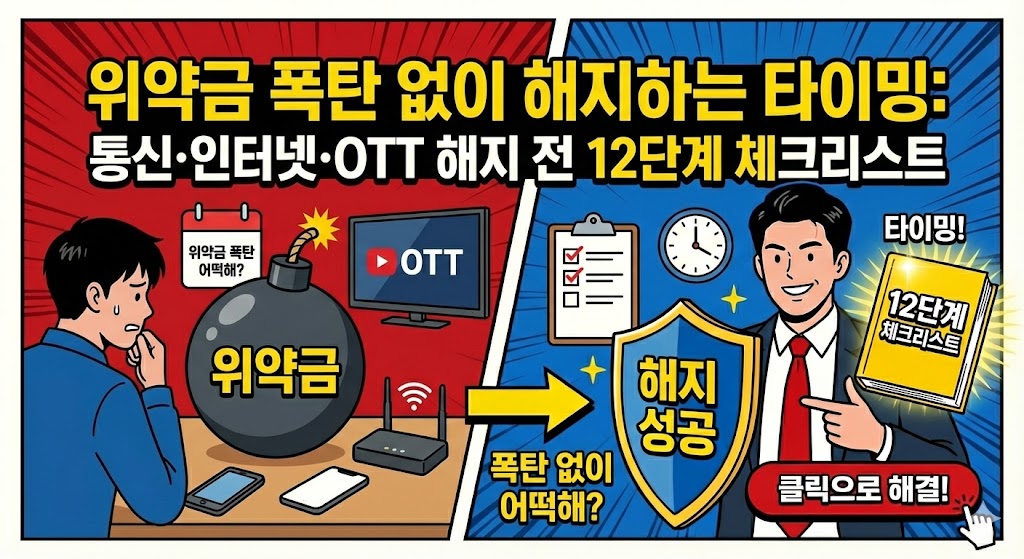 통신사/인터넷/OTT를 해지할 때 위약금이 크게 나오는 이유(약정·할인반환·결합할인·장비 미반납·요금 일할 계산)를 먼저 분류하고, 해지 타이밍을 잡아 위약금을 줄이는 12단계 체크리스트와 고객센터 문의 템플릿을 정리했습니다.