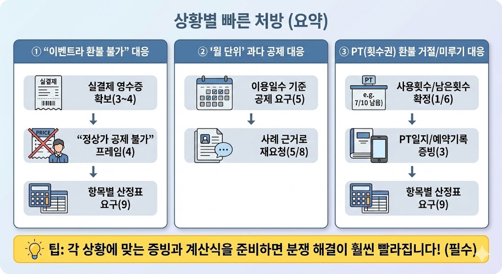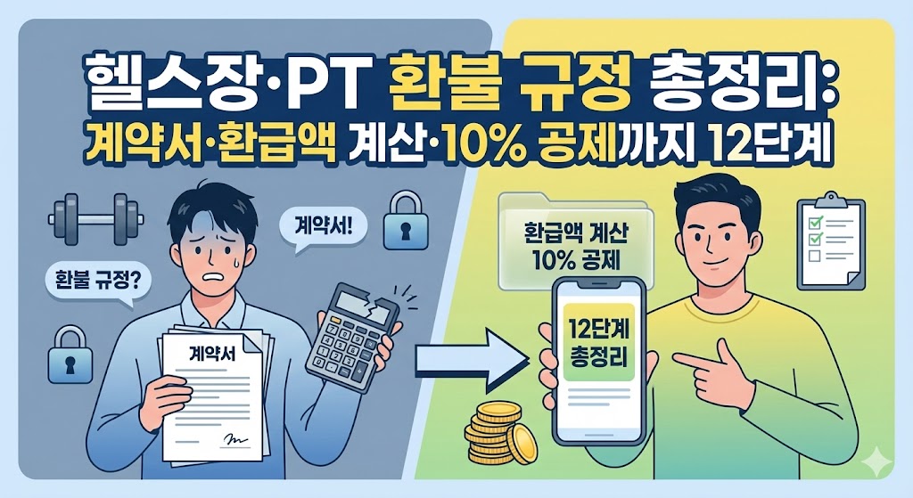 헬스장/필라테스/PT 중도해지 시 환불액 산정에서 가장 많이 싸우는 포인트(정상가 vs 할인가, 일할 vs 월할, 10% 공제, 시작일/개시일, 장기권/횟수권)를 기준으로, 계약서 체크 → 환급액 계산 → 증빙 확보 → 사업자/플랫폼 대응 문구까지 12단계로 정리했습니다.