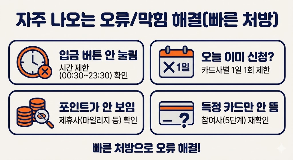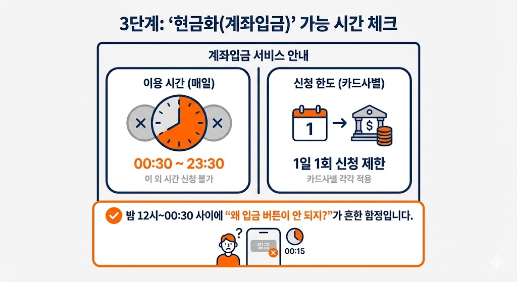 ✅ 조회는 상시 가능하지만, 계좌입금은 보통 00:30~23:30, 그리고 카드사별 1일 1회 제한이 안내됩니다.