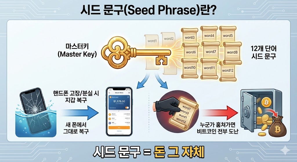 2강 지갑을 생성하면서 화면에 12개의 영어 단어가 떴었죠? 오늘은 이 *'시드 문구(Seed Phrase)'*를 안전하게 백업하는 날입니다.