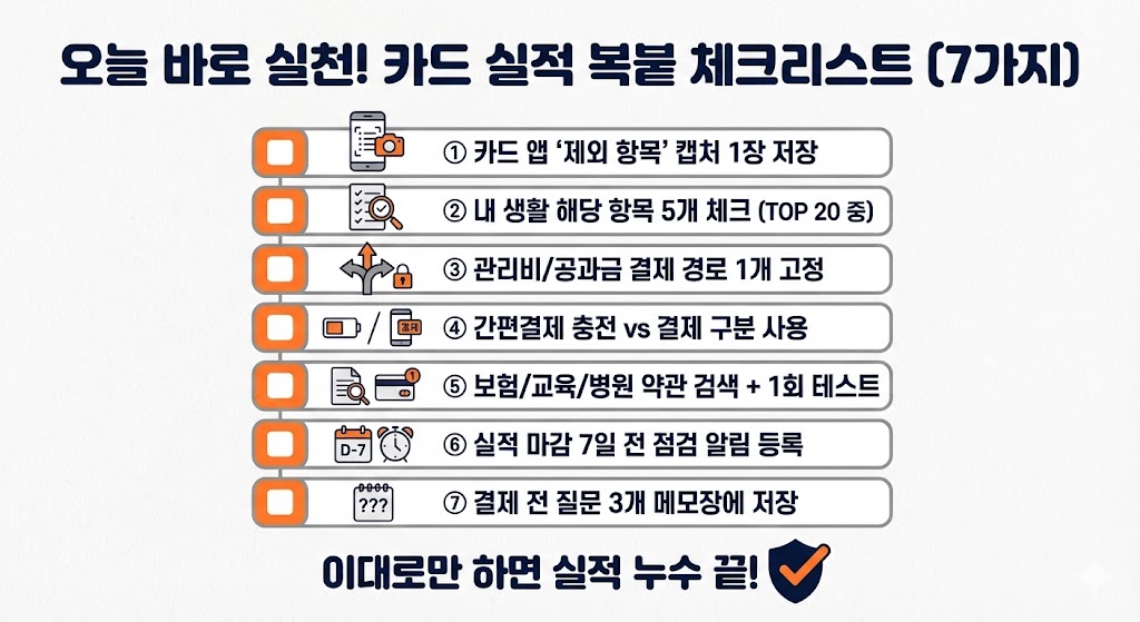 오늘 바로 할 3개: 카드 앱에서 ‘실적 제외’ 캡처 → TOP 20 중 내 생활에 해당 5개 표시 → 결제 전 확인 질문 3개 저장