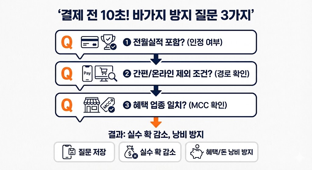 👉 해결: “한 달만” 소액 테스트 결제 후 카드 앱에서 실적 반영 여부 확인하고 경로를 고정하세요.