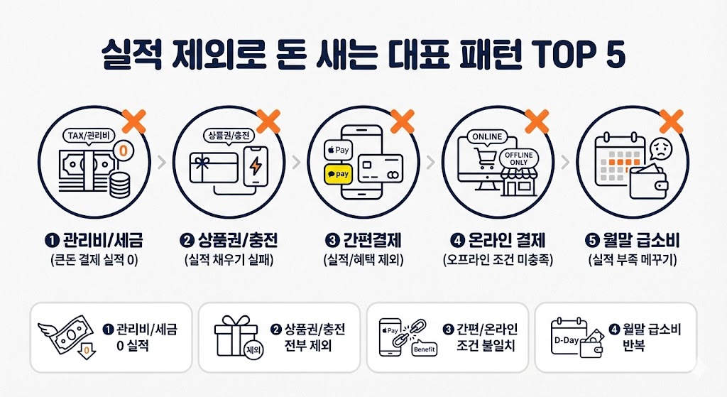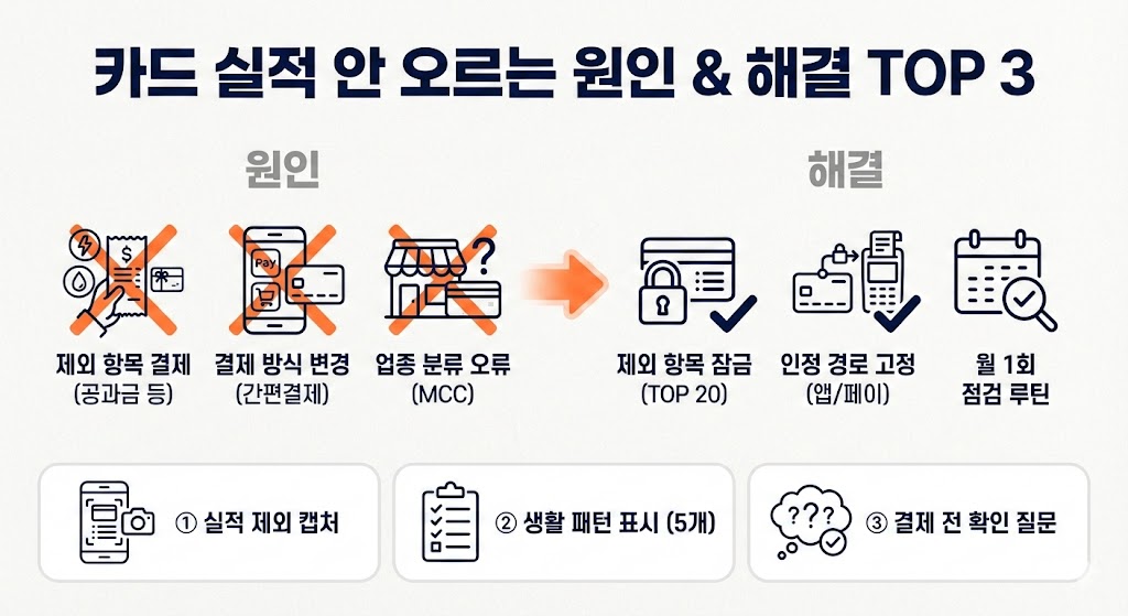 실적이 안 오르는 대표 원인은 ①공과금/세금/상품권/충전 같은 자주 제외되는 항목 결제 ②간편결제/온라인 결제로 조건이 바뀌는 경우 ③가맹점 업종 분류(MCC) 때문에 혜택/실적이 빠지는 경우입니다.