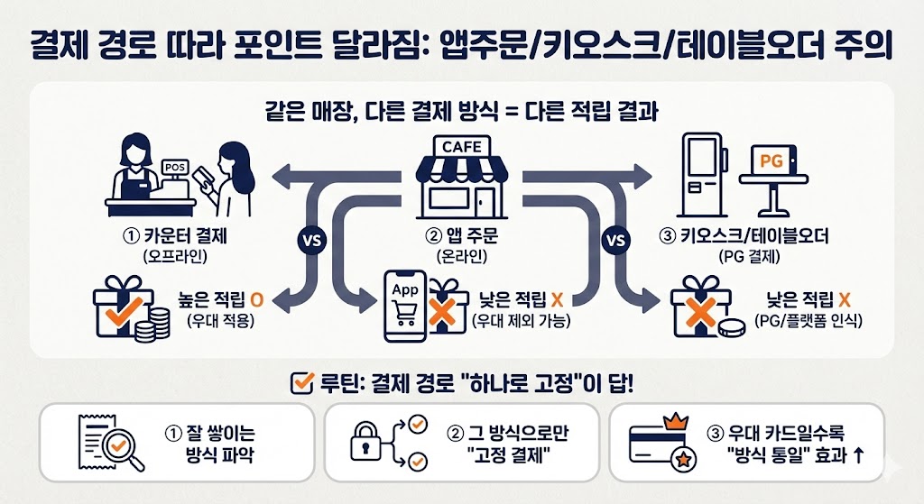 - “그 매장에서 포인트 잘 쌓이는 방식”을 1개 정하고 항상 그 방식으로만 결제