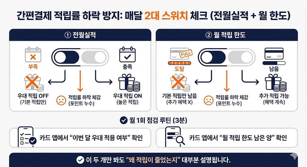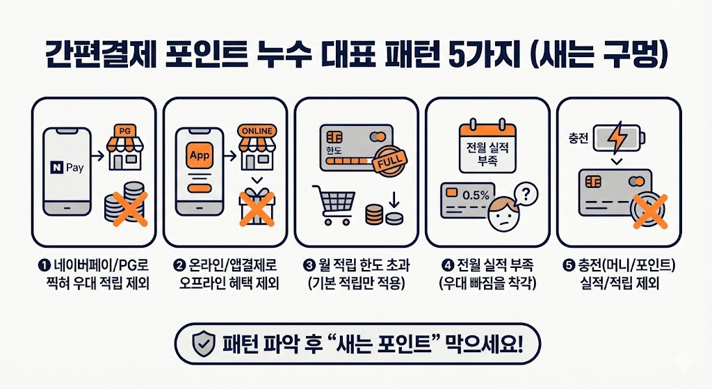 간편결제에서 포인트가 새는 이유는 대부분 ①페이로 결제하면서 가맹점이 ‘플랫폼’으로 잡힘 ②카드가 간편결제/온라인 결제를 혜택 제외로 둠 ③월 적립 한도/전월 실적 조건을 놓침 때문입니다.
